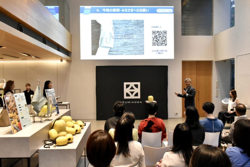 多くのFUMIKODA製品の愛用者様に、漁業系廃棄物の現状や新たに開発された人工皮革の製造工程などをお話しする機会をいただきました。皆様には関心を持ってご覧いただき、購入いただいたお客様も多数いらっしゃいました。