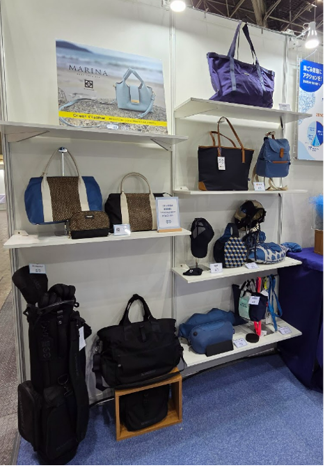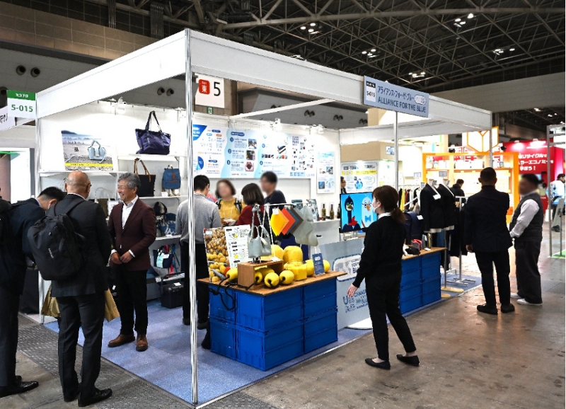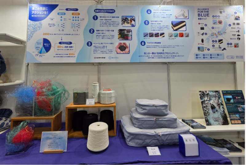 昨年に続き2度目の参加となる今回は、多様な業種の企業担当者様や学生の皆様など、3日間で約300名の方々にブースへお越しいただきました。展示ブースでは、廃漁網を利用した学生服や、使用済み漁業用フロートをリサイクルした人工皮革など最新のプロダクトをはじめ、海洋環境保全や教育への取組などAlliance for the Blueの活動全体を紹介しました。いくつもの廃漁網由来のプロダクトが実際に販売されていることや、そのバリエーションの広がりに驚きの声をいただくなど、海の廃棄物を使ったビジネスに対する具体的な関心の高まりを感じた貴重な機会となりました。