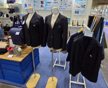 一つ目の最新プロダクトは、菅公学生服株式会社と共同開発した学生服です。昨年のエコプロでの出会いをきっかけにプロジェクトが始動し、わずか1年で生地開発、商品化まで漕ぎ着けました。 漁網由来のプラスチックをケミカルリサイクルしたナイロンを、ウールやポリエステルと混合(10〜25%)することで、高い品質を維持したまま、海の資源を守るユニフォームを実現しました。