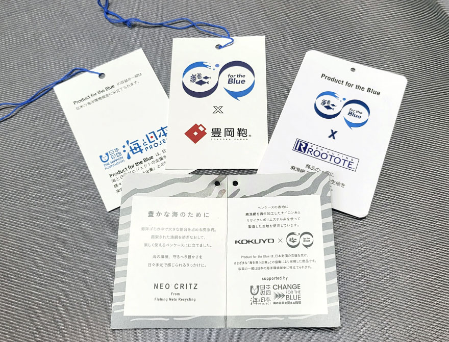 2020年に、住江織物様と生地の試作を実施。その後、モリトアパレル様で生地の量産・多品種化を実現。2021年にこれらを活用した多種多様なバッグシリーズが兵庫県鞄工業組合(豊岡鞄)様の各社で開発され、販売を開始しました。当社との協働で生まれた商品ラインナップをfor the blueシリーズとし、ナイロンのもつ丈夫さと軽さを活かし、さまざまなバッグの製造に活用しています。